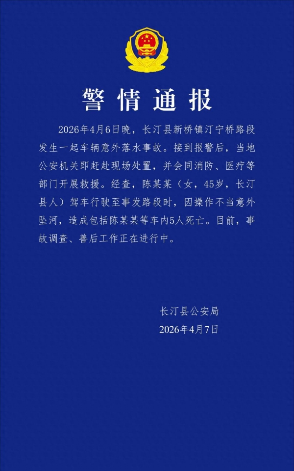 4月6日深夜,路面湿滑、视线不清。一辆SUV在桥上突然失控撞向护栏,在短暂的瞬间里,车辆就冲破了栏杆掉入湍急的江水中。车上五人全部遇难,其中三个是孩子,悲剧让人痛心疾首。