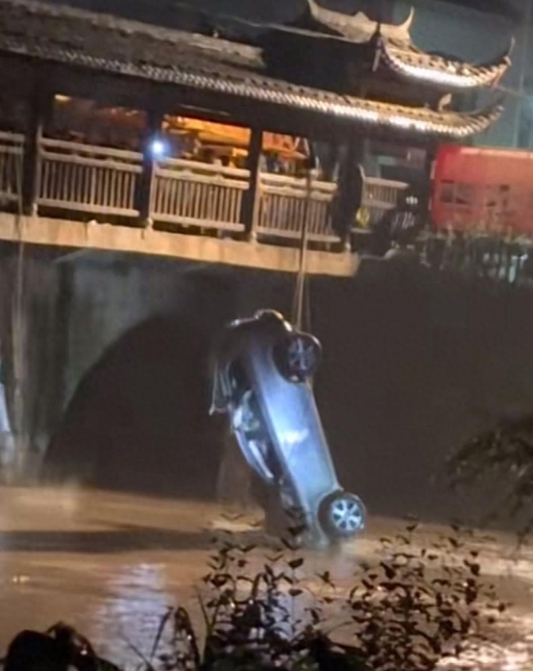 桥边的几个人发现了异状,连忙跑过来喊叫求救,但是却只能眼睁睁地看着车辆"顶开"木护栏坠入暴涨江水之中,并且没有人能够及时施以援手。