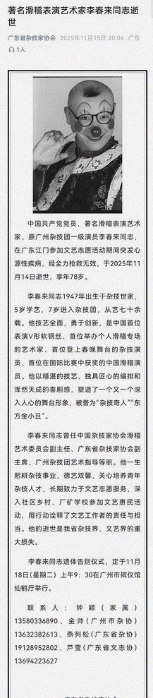 据广东省杂技家协会11月15日发布的讣告确认,死因系突发心源性疾病