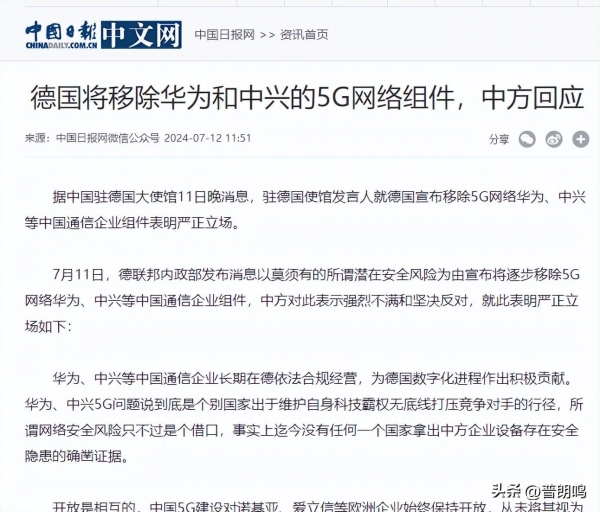 信息来源:中国日报--德国将移除华为和中兴的5G网络组件,中方回应