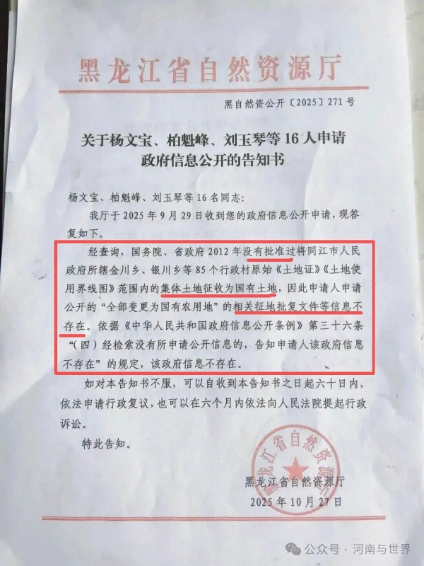 2025年10月27日黑龙江省自然资源厅回复,经查询,国务院、省政府2012年没有批准过将同江市人民政府所辖金川乡、银川乡等85个行政村原始《土地证》《土地使用界线图》范围内的集体土地征收为国有土地。