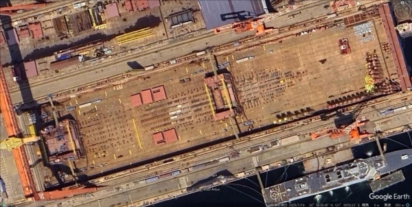 近一年里,有关中国海军第四艘航母004型的消息,在军迷圈中的讨论几乎从未断过。各种传闻从核动力还是常规动力、排水量,到舰载机数量、舰岛设计,都引发了无数猜测。而近日,"谷歌地球"更新的一组卫星照片再次让这一话题升温--在北方某大型造船厂船坞内,出现了两个宽度超过42米的巨型分段,形态与航母水下舰体颇为相似。这两个分段真的是004型航母的组成部分吗?还是大型民用船舶的模块?在信息有限的情况下,我们不妨通过已知的三个关键信息,来逐一分析。