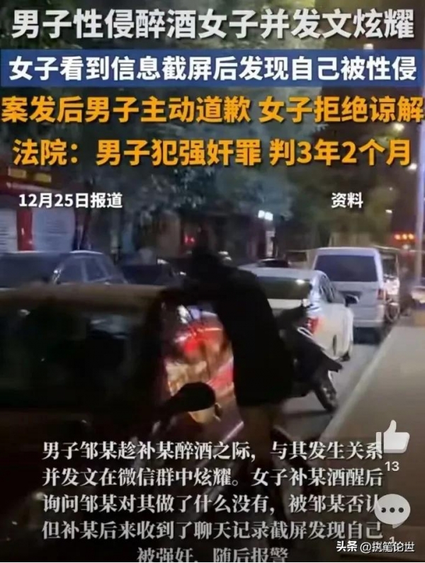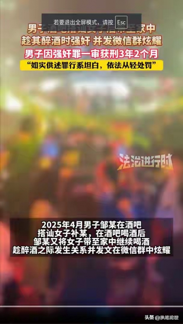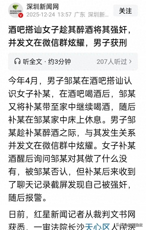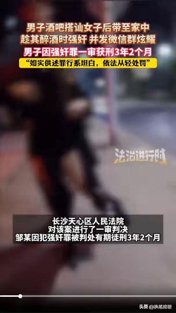 2025年12月,多则权威媒体报道了一起令人愤慨的强奸案:长沙一男子在酒吧搭讪醉酒女子后,趁其失去意识实施性侵,事后竟在微信群发布炫耀内容,最终被法院依法判刑。看完整个案件细节,真的让人既愤怒又寒心,醉酒从来不是"可乘之机",而是施暴者暴露丑恶本性的照妖镜。