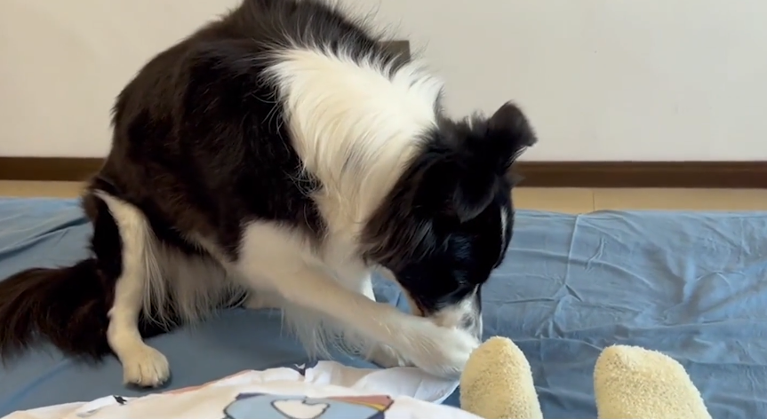 近日,吉林,一位主人发视频称:自家养的边牧犬有一天突然掀开了她的被子。只见狗子将被子掀开露出了主人的脚,主人不解,只见狗子将一只爪子按在了主人脚上,随后又用爪子捂住了自己的鼻子,主人猜测:脚臭?狗子立马冲出房间叼了洗脚盆进来,并将一只爪子放在了洗脚盆里,主人崩溃:洗脚!