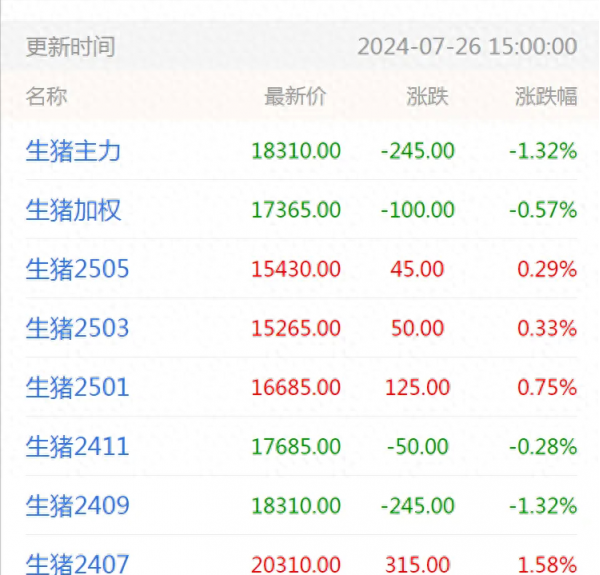7月渐入尾声,在国内生猪合约方面,截止本周五,国内生猪主力合约报价涨跌调整,其中,2407合约报价在20310元/吨,上涨315元/吨;生猪2409合约报价在18310元/吨,下跌245元/吨;2411合约下跌50元/吨,跌至17685元/吨;生猪2501合约上涨125元,涨至16685元/吨;生猪2503合约报价在15265元/吨,上涨50元/吨……