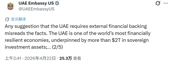 不过,阿联酋驻美大使馆同日在社媒X发表声明,否认该国需要外部救助。