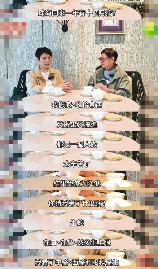 返港的一年间,陈嘉仪十个月都在生病,因为搬家、收拾东西等劳心劳力的活都需要年过七十的她亲自操持,因此免疫力下降,染上疾病,但她依旧一个人扛了过去。