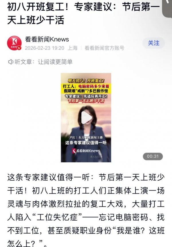 今年正月初八作为节后上班第一天,专家建议"上班第一天少干活"。毕竟春节假期期间,大家都沉浸在幸福的氛围当中,再加上今年春节假期休息的时间比较长,连休了九天,怕节后上班第一天会不适应,因此复工后优先处理简单轻松的任务。