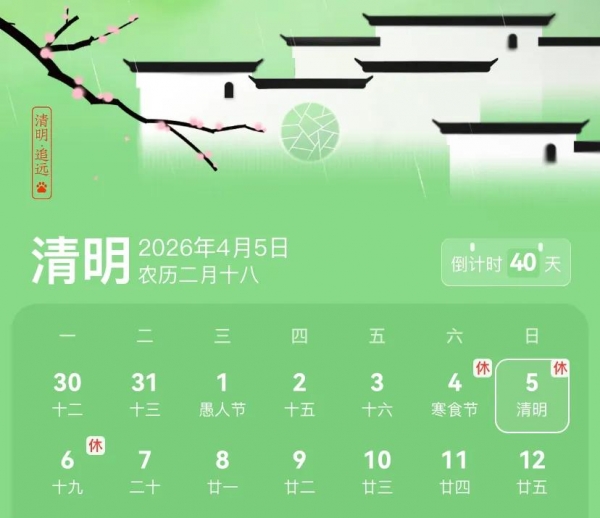 距离下一个假期还有清明节到来还有40天,清明节放假时间为2026年4月4日(周六)至6日(周一)放假,一共3天。