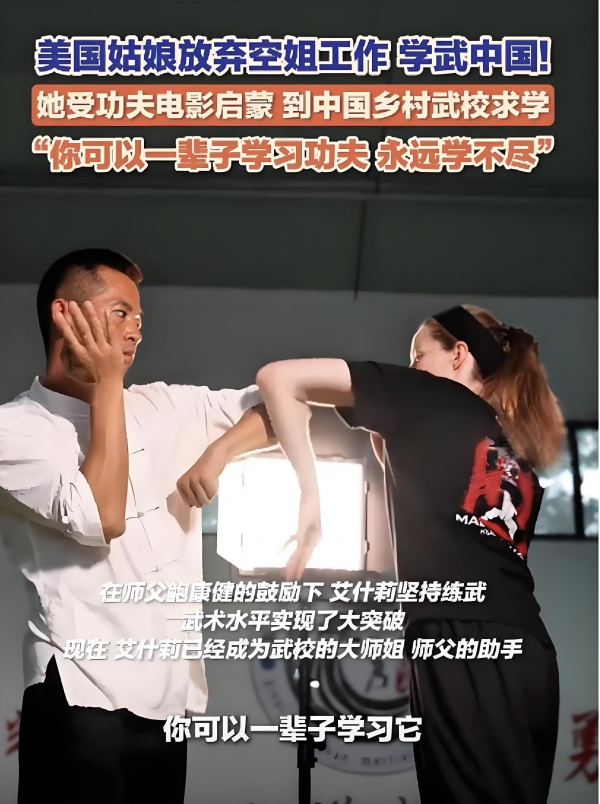 2019年,正赶上艾什莉事业渐入佳境,但她认准了一个道理:"人这一辈子,总要为自己做一次选择。"于是她悄悄递了辞呈,背着行李只身来了中国,站在江苏新沂的弘禅武术学校门口,成了这里最特殊的新生。