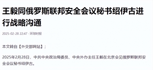 绍伊古先是与王毅外长举行了会谈,双方就乌克兰危机深入交换意见,俄方介绍了俄美接触最新情况和俄方立场考虑,中方表示将继续为劝和促谈发挥建设性作用。