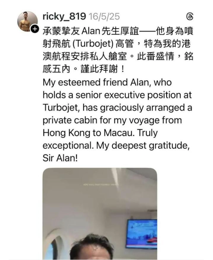 进一步翻查发现,郑震生曾在2025年5月发布类似内容,自称获喷射飞航高级管理人员"挚友Alan"安排,乘坐私人舱室从香港前往澳门,并附上舱内沙发、电视等设备照片,配文"承蒙挚友厚谊,此番盛情,铭感五内"。两次公开炫耀"特殊待遇",没想到因此丢了饭碗。