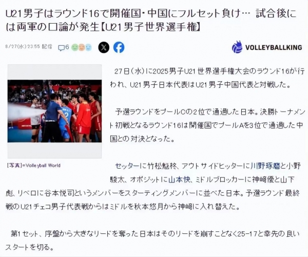 然而,就在中国队队员们激动地相拥庆祝胜利之时,意外发生了。日本队9号球员小野骏太情绪失控,冲向中国队教练组大声指责,并使用了不文明的语言进行辱骂,随后又与中国队的高宇宁发生口角。尽管日本队2号球员川野琢磨试图拉开小野骏太,但他仍不依不饶,导致双方队员在网前发生了短暂的对峙,场面一度混乱。好在现场工作人员和双方教练及时介入,迅速平息了这场风波。