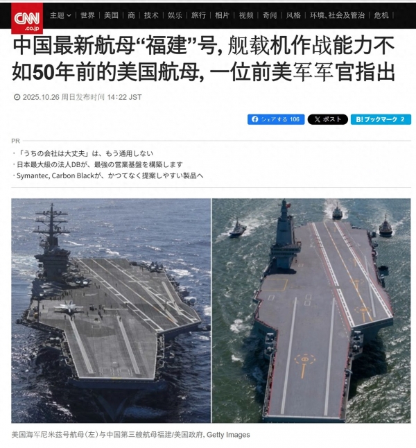 有意思的是,在事故发生前不到24小时,美媒CNN,26号在报道中引用两位美军退役军官、海军上校舒斯特和海军少校斯图尔特针对解放军海军发展的分析称,解放军航母"中看不中用",即便是最新的福建号超级航母,虽然技术先进,但其作战能力仅仅相当于50年前服役的美国"尼米兹"级航母的60%。