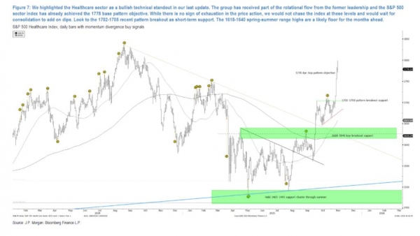 报告指出,医疗保健板块是轮动中的一个亮点,吸引了部分从前期领导板块流出的资金,其行业指数已达到1778点的目标位。但分析师建议,不应在当前水平追高,而应等待盘整时逢低吸纳。