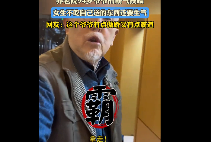 近日,一段视频显示,画面中女孩被养老院94岁爷爷的霸气投喂,女生不吃自己送的东西还要生气,网友:这个爷爷有点傲娇又有点霸道