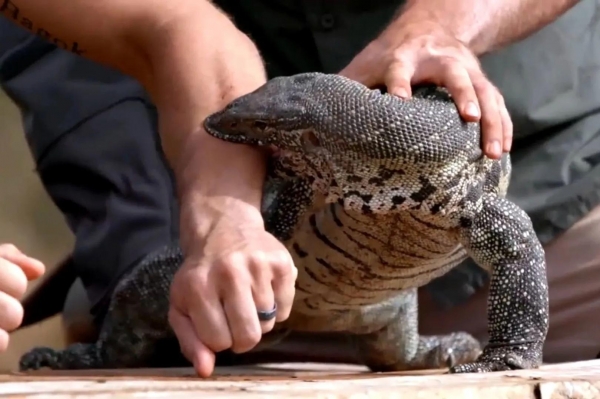 值得一提的是,被钓上岸的圆鼻巨蜥刚刚成年,在水中潜伏时,错把鱼饵(路亚假饵)当成了老鼠和青蛙,于是就被拉了出来,所以上岸后边凶性大发,追着人咬。