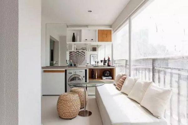 最满意的就是阳台了,阳台这里被设计师利用的最充分,不光放了一个沙发,沙发的旁边还安装了一个收纳柜,收纳柜底部还放了洗衣机。