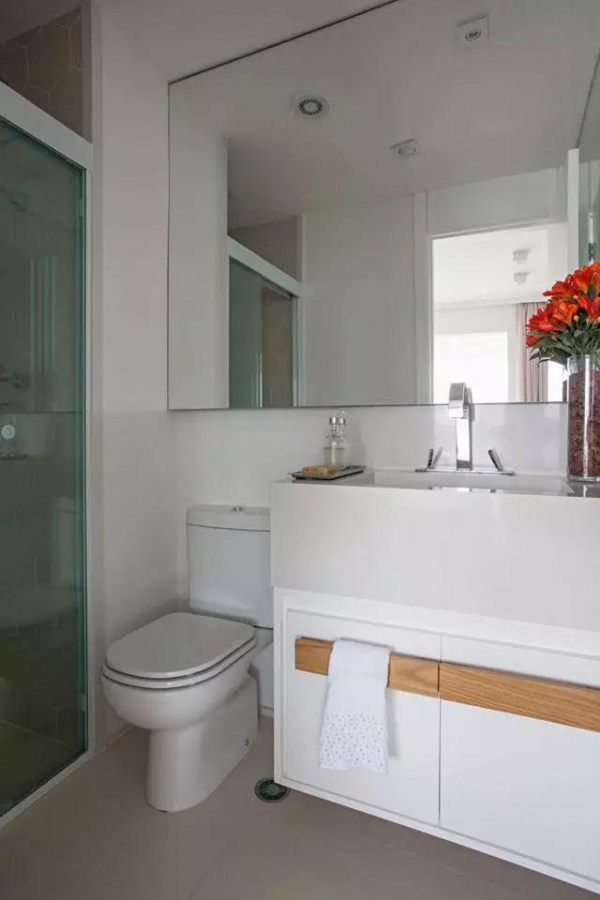 最后是卫生间,空间比较小,装了浴室柜之后就更紧凑了,不过还好该有的功能都有,也不要求更多了。今天小编芳芳给大家带来的是一个40平米小户型的公寓,当我看到这个设计的时候也是被惊艳到了,第一次看到小户型装修的这么精致,别看房子面积小,但是当你近距离体验之后,就会觉得收纳空间超大,下面一起来看看吧。