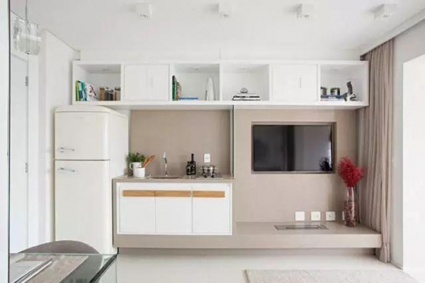 客厅的电视上方的位置还做了吊柜,增加收纳是小户型装修的第一守则。