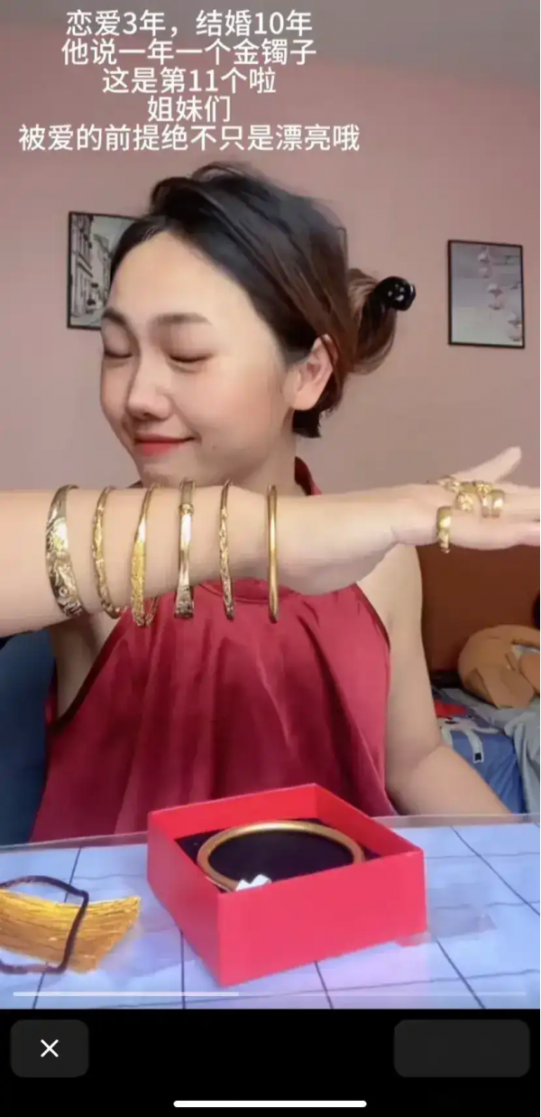 近日,一位美女在自己的社交媒体上晒出了自己收到的十年金镯子,据悉,这些金镯子都是她老公每年送给她的结婚纪念礼物,而且每一只金镯子都十分精美,看得出来,其中花费的心思和金钱都是非常多的,本来这样的浪漫故事应该会受到大家的一致好评,就在这位美女晒出金镯子的她还配文"不给就换个男人",这样一来,就让很多人感到非常的不适,觉得这样的配文有些过于刻意和霸道了,而且也给人一种在炫耀和煽情的感觉,所以在她晒出金镯子之后,也引发了很多网友的热议和调侃。