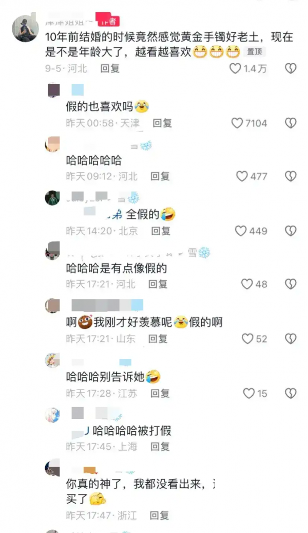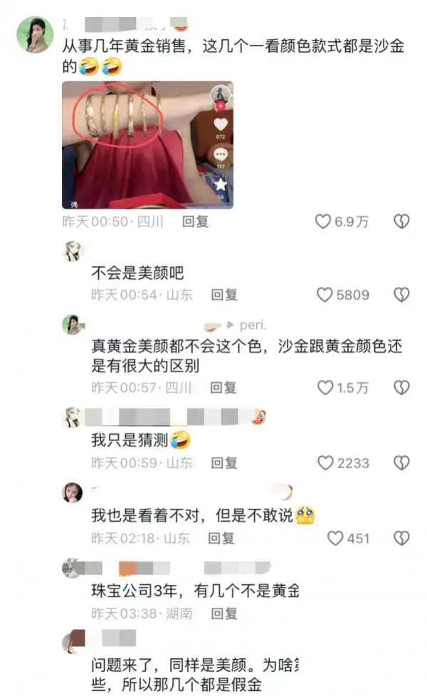 原本这样的事情看似只是一则晒财晒物的帖子,但是随着网友的深入调查,却发现了其中的蹊跷,这些金镯子很可能都是假的,只是外表看起来十分精美而已。