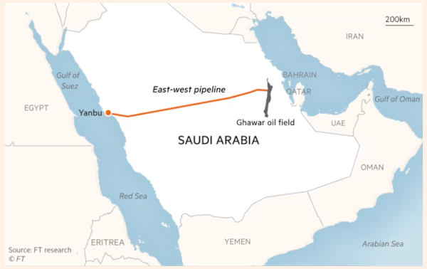 延布港通过一条约1200公里长的管道与沙特东部产油区相连,这使得石油运输无需经过霍尔木兹海峡。