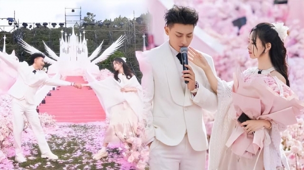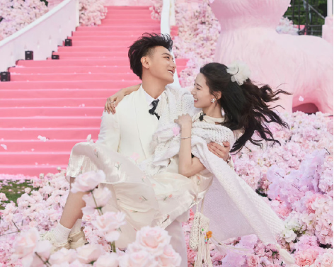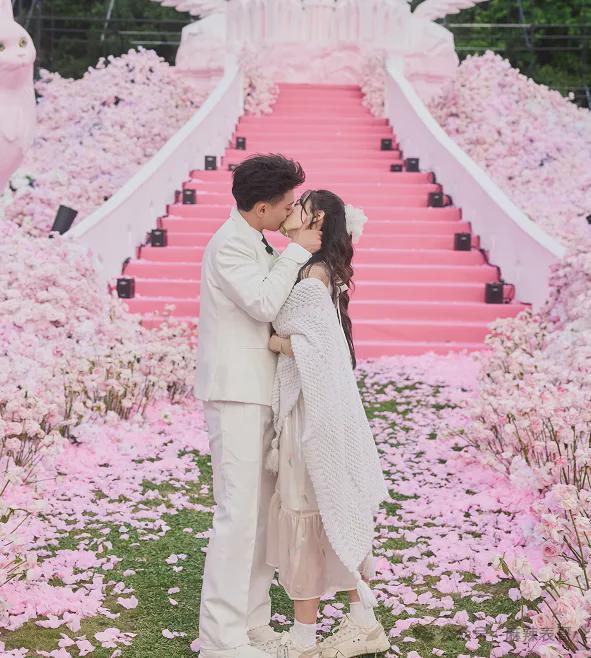 现场布置成粉色玫瑰花海,因为徐艺洋喜欢小动物,家里的宠物也被精心设计成装饰。