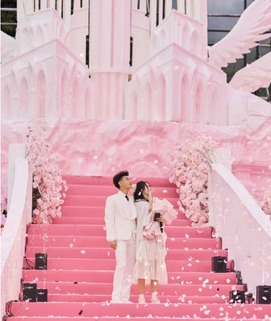 求婚成功后,舞台背后放了粉红色礼花。