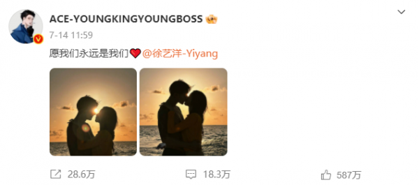 7月14日,黄子韬和徐艺洋先后发了官宣微博,配文选的还是李晨同款: