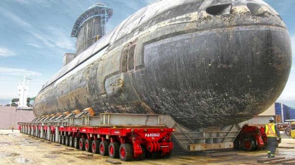 自行式模块运输车既然看起来这么大,当然主要就是运送重物的,而且主要还是巨型重物,比如像军舰这样的大型装备,其特点又重又高又大,如果是在陆地上运输,常规的设备根本不可能拉着军舰跑。