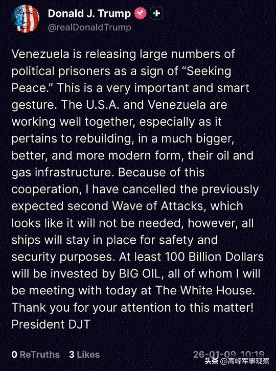 所谓"国不可一日无主",马杜罗政府副总统德尔西.罗德里格斯,按法律程序上位成为委内瑞拉代总统。德尔西被美国官方和媒体描述为"合作者"。目前,特朗普宣布取消了对委内瑞拉的第二波军事攻击,理由是美国和委内瑞拉最近几天成功合作。他还强调了他即将在白宫与主要石油公司的代表会面,讨论在委内瑞拉的投资机会。另外,美国国务院的一个代表团已经抵达加拉加斯,商谈恢复美国在当地的大使馆。