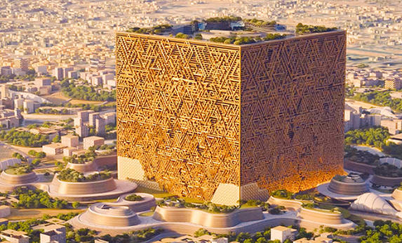 沙特阿拉伯雄心勃勃,推出"2030年"愿景基建框架,其中包括位于利雅得市中心"新穆拉巴"新区开发项目核心位置的一座巨型立方体摩天大楼--穆卡布四方城(Mukaab)。