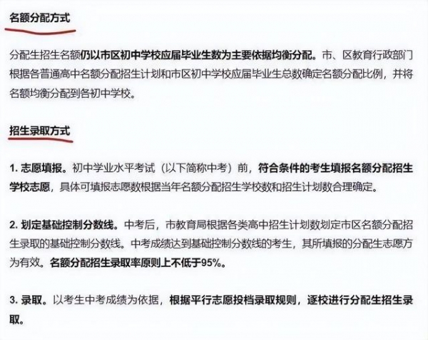 在通知里,明确提到教育部门将根据各普通高中名额分配招生计划,以及市区初中学校应届毕业生总数,确定名额分配比例,并将名额均衡分配到各初中学校。