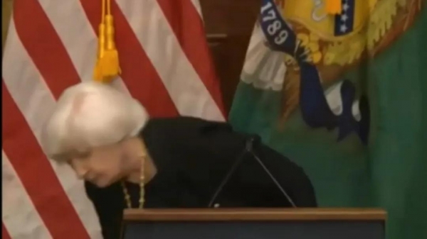 10月22日,国际货币基金组织和世界银行年会在华盛顿召开,在记者向美国财政部部长耶伦提问美元地位是否稳固时,美国财政部徽章戏剧性地掉落在地。