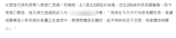 袁惟仁的二姐袁蔼珍亲自证实了弟弟的死讯,她悲痛不已地表示,袁惟仁走得平静且自由,没有遭受太多痛苦。后续,家属将把袁惟仁的遗体带回台北,让他与父亲长眠在同一个地方,得以落叶归根、陪伴至亲。袁惟仁生前创作了无数经典歌曲,滋养了一代人的青春,家属也特意写下一段文字缅怀他:"庆幸他留下很多歌曲,想念他时听,开车时听,伤心时听,平静时听……,他无所不在。谢谢所有帮助、关怀小胖的朋友,他是带着你们的温暖离开的。"字里行间,满是不舍与感激。 女星陆元琪与音乐人袁惟仁曾有过一段婚姻,两人于2002年携手步入婚姻殿堂,共同孕育了一双儿女,却在2016年因种种原因协议离婚,和平结束了这段婚姻。