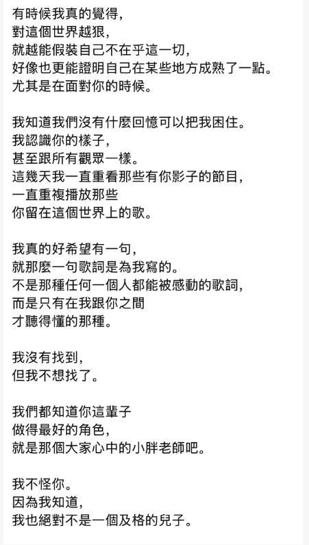 首先想跟照顾爸爸七年的二姑姑及奶奶致上最大的感激 这几天我一直在想 七年后, 站在告别前,真的会比较容易吗? 我不知道。 我只知道,我一点也没有更勇敢。 直到时间快用完的时候, 我还是一样拿工作当挡箭牌选择逃走。 一开始总觉得坐在前往台东的飞机上感觉好遥远, 后来才发现不是台东远, 是有你在的地方总是离我很远很远。 有时候我真的觉得, 对这个世界越狠, 就越能假装自己不在乎这一切, 好像也更能证明自己在某些地方成熟了一点。 尤其是在面对你的时候。 我知道我们没有什么回忆可以把我困住。 我认识你的样子, 甚至跟所有观众一样。 这几天我一直重看那些有你影子的节目, 一直重复播放那些 你留在这个世界上的歌。 我真的好希望有一句, 就那么一句歌词是为我写的。 不是那种任何一个人都能被感动的歌词, 而是只有在我跟你之间 才听得懂的那种。 我没有找到, 但我不想找了。 我们都知道你这辈子 做得最好的角色, 就是那个大家心中的小胖老师吧。 我不怪你。 因为我知道, 我也绝对不是一个及格的儿子。 我只是想在你面前叛逆一次。