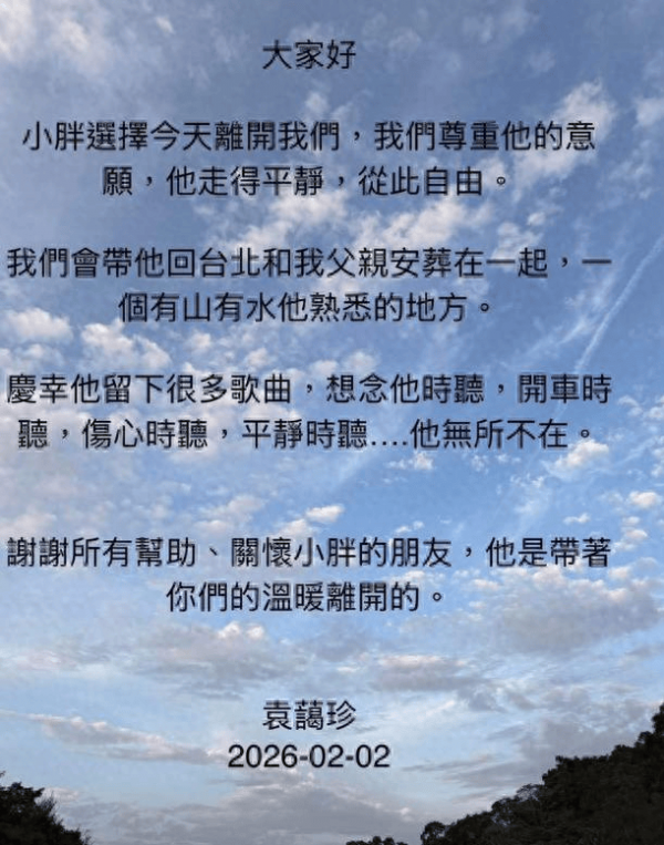 如今袁惟仁突然离世,陆元琪也透过经纪人向台湾媒体作出回应,语气克制而沉重:"琪姐在今天中午知悉相关讯息,后续相关事宜小胖老师的家属正在处理中,恳请媒体朋友体谅,给予琪姐和孩子空间,感谢体谅与关心",言语间透露着对孩子的保护,也藏着难以言说的伤感。