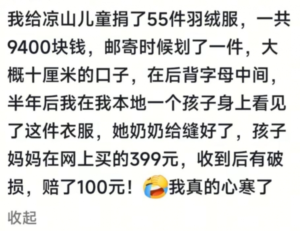 黄女士的遭遇并非孤例。今年初,四川广安的杨女士姐弟定向捐赠甘肃临夏地震灾区学校的400件价值10万元的御寒衣服,通过邮政快递邮寄后几乎全部丢失。