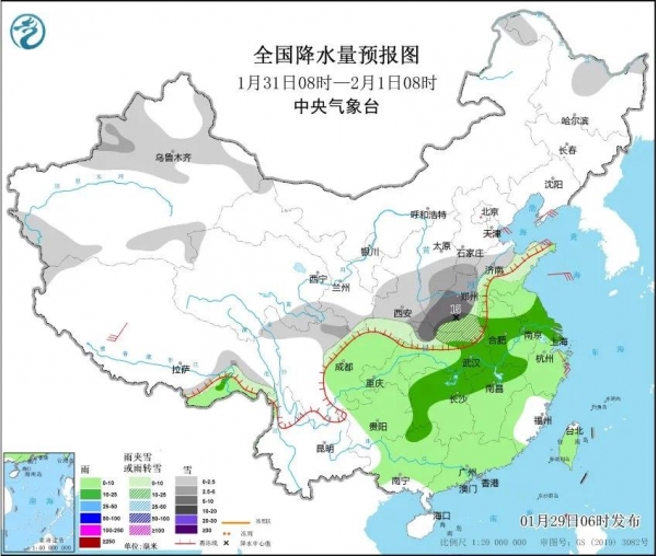 受西南暖湿气流的发展和冷空气共同影响,预计明天晚间开始到初三,我省将出现新年首场大范围雨雪天气过程,降水相态复杂、部分县市降雪量大。30日夜里(大年初二)至31日(大年初三)为主要雨雪时段,根据预测来看,我省中西部有大雪、局部暴雪,北部,东部有小到中雪,南部,东南部小到中雨转雨夹雪或中到大雪,局部暴雪,其他县市雨夹雪转中到大雪。