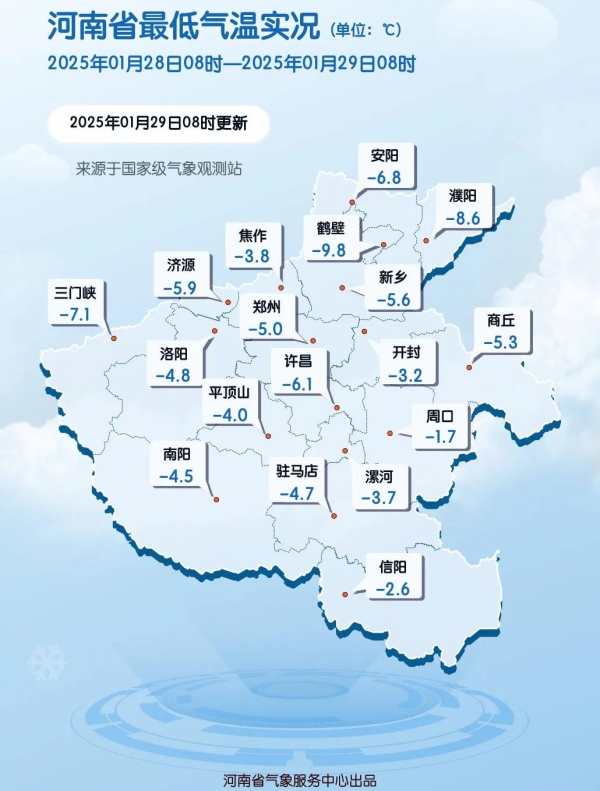 雨雪后我省的气温也迅速下滑,持续了半个月的偏暖格局迅速回落到往年四九天该有的寒冷水平。根据河南气象发布的实况数据来看,昨天我省大部分地区基本太阳一落山就迅速降至零下,除夕夜放鞭炮的时候伴随着阵阵寒意,夜间最低气温在零下8到零下5度,局部甚至可达零下10度,像三门峡市卢氏-11.7℃,鹤壁市浚县、三门峡市渑池、濮阳市范县-9.8℃,洛阳市栾川-9.7℃,夜间凌晨还是很冷的。