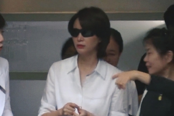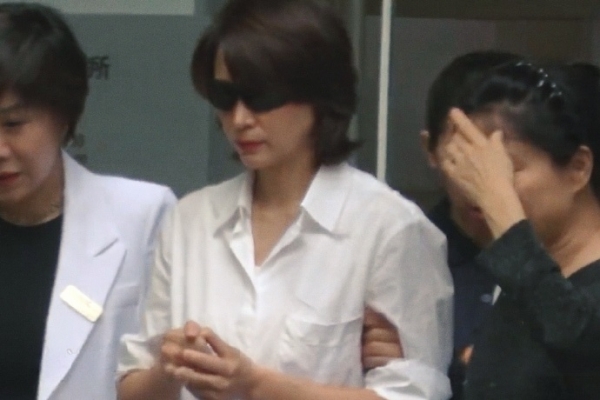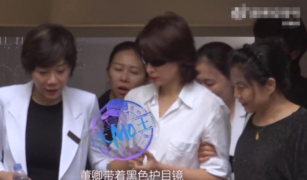 画面中,52岁的董卿戴着黑色护目镜,在黑衣助理的搀扶下缓缓走出医院大门,在她的右手旁是一名身着白大褂的女医生。