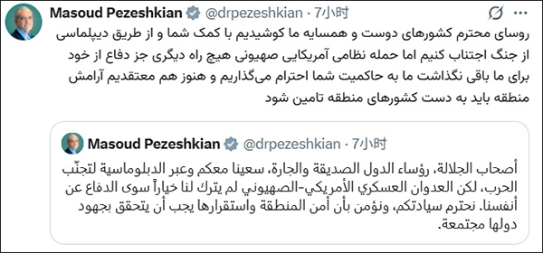 当地时间3月4日,伊朗总统佩泽希齐扬在社交媒体用阿拉伯语和波斯语发帖。