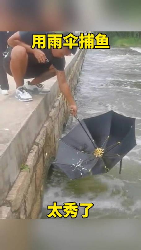 不需要多么精巧的工具,一把大黑伞就足矣!等鱼一跳上来的瞬间,用伞一网,就能捉住一条大鱼!