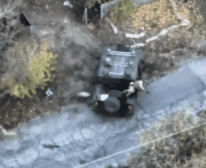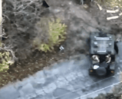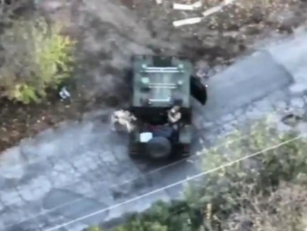 一架FPV无人机朝着乌军车辆飞奔而来,车上的一名乌军眼看情况不对立马跳车,枪都撂地上不管了;