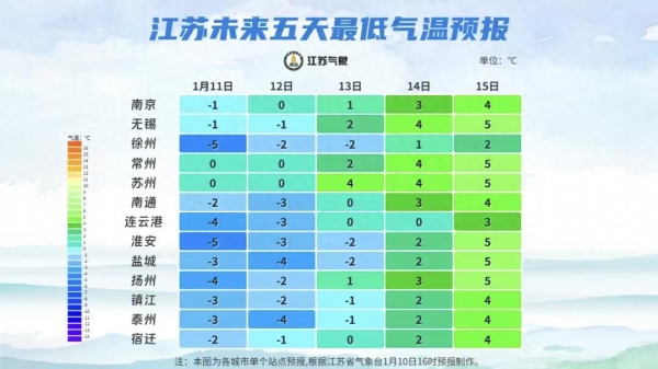 冷意阵阵的冷空气还在影响江苏,今早全省多地气温跌至低点,沿淮和淮北地区最低温-4℃至-5℃,其余区域-2℃至-3℃,大部分地区出现冰冻天气,体感寒意十足。不过好消息是,回暖的脚步已经临近,12日起全省气温将开启回升模式。