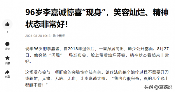 信息来源:鲁中晨报2024.8.28--96岁李嘉诚惊喜"现身",笑容灿烂、精神状态非常好!