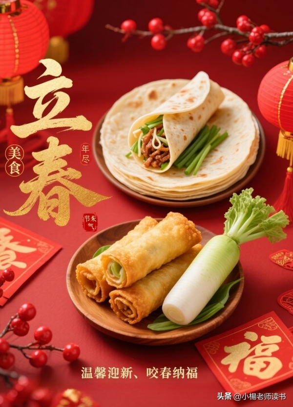 1.咬春尝鲜,应时养生。立春当日,不少地方延续着"咬春"传统,即品尝春饼、春卷、鲜萝卜等节令食物。这不仅是习俗传承,也契合健康理念:春季新鲜蔬菜富含维生素与纤维,能助解积滞;辛味食材可通阳发散,呼应中医"春夏养阳"之道;一家人动手制作应节食物,还能在温馨互动中增进亲情。