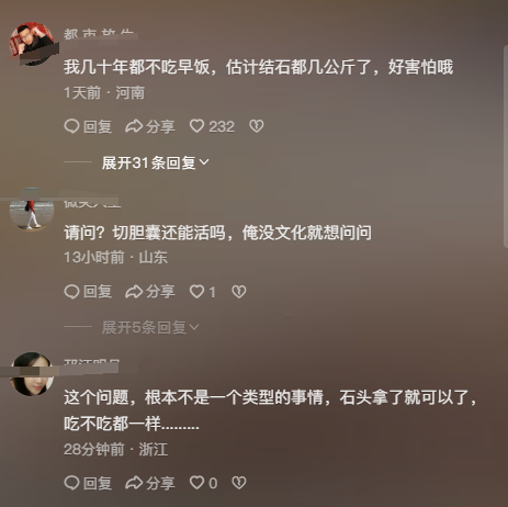 还有网友表示:我天天吃早餐也得胆结石,胆里面也都是石头,胆囊切除了,这跟吃早餐没什么关系吧。跟不吃早餐有啥关系,我们这边从史以来都是两顿饭