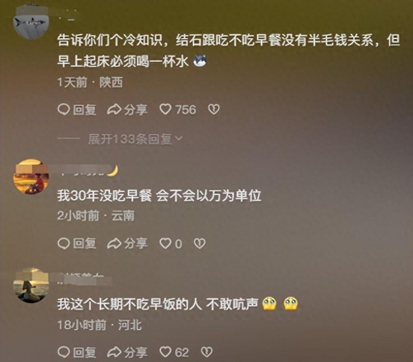 也有网友表示:我几十年都不吃早饭,估计结石都几公斤了,好害怕哦。这个问题,根本不是一个类型的事情,石头拿了就可以了,吃不吃都一样.........哇,我都不记得,我多久没吃早餐了